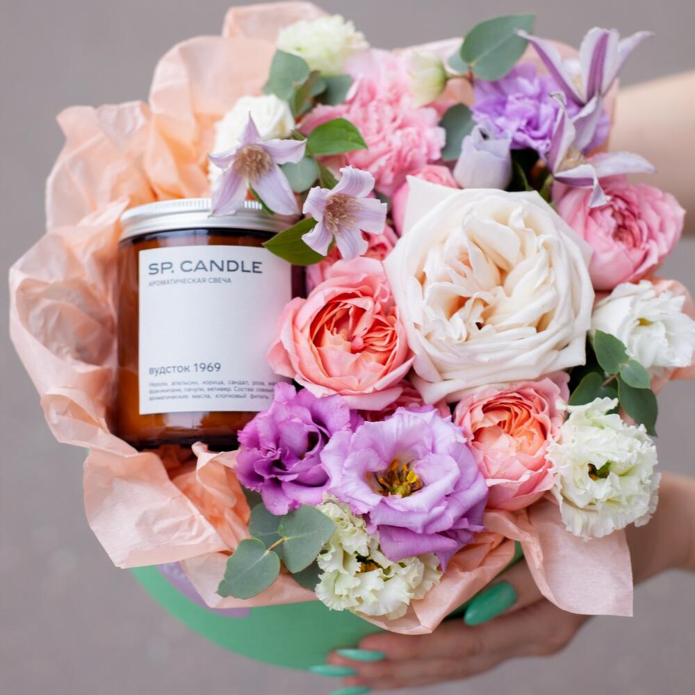 Цветы в коробке с аромасвечой SP CANDLES