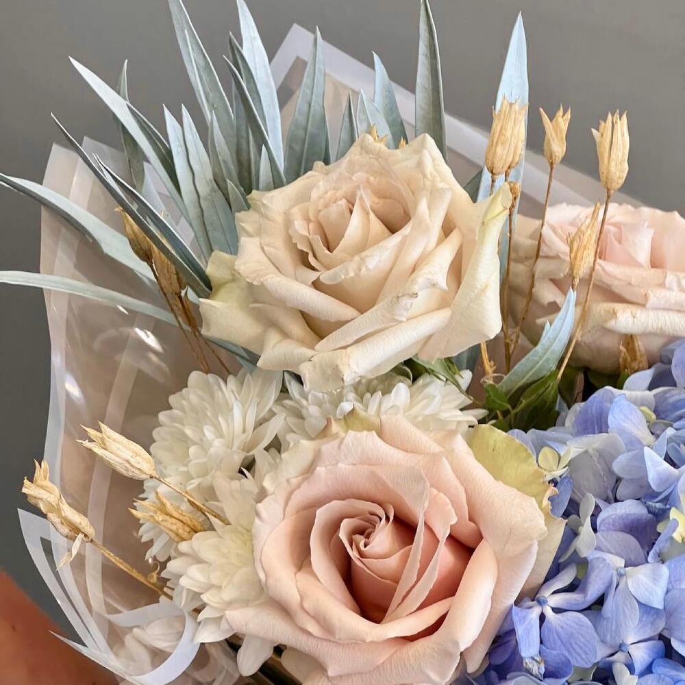 Голубая гортензия и пудровые розы