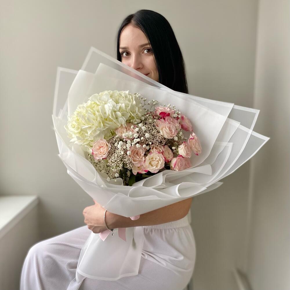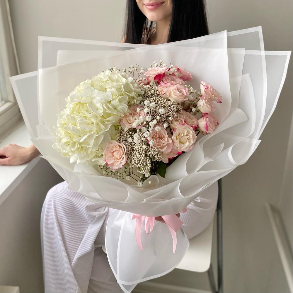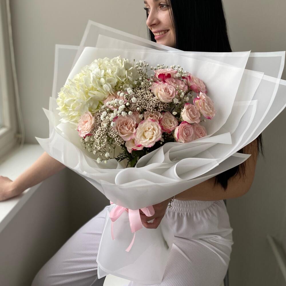 Гипсофила – 2 шт.Гортензия – 1 шт.Озотамнус – 3 шт.Роза кустовая – 5 шт.Лента атласная – 2 шт.Упаковка дизайнерская – 4 шт.