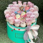 Роза голландия – 23 шт. Клубника в шоколаде – 6 шт. Шляпная коробка – 1 шт. Оазис флористический – 2 шт. Лента атласная – 2 шт.