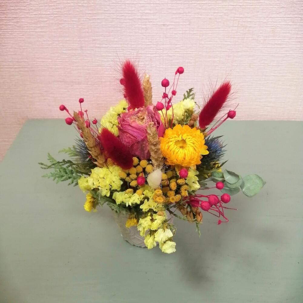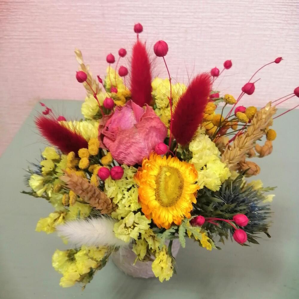 Лагурус – 5 шт.Роза сухоцвет – 2 шт.Гелихризум – 1 шт.лен сухоцвет – 1 шт.Рожь – 3 шт.Статица – 1 шт.кипарисовик – 1 шт.Оазис флористический – 1 шт.Кашпо керамическое – 1 шт.