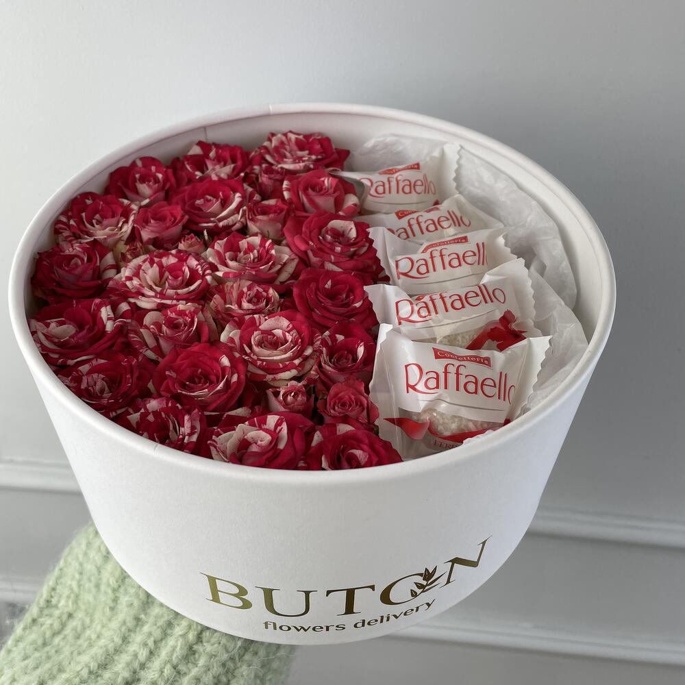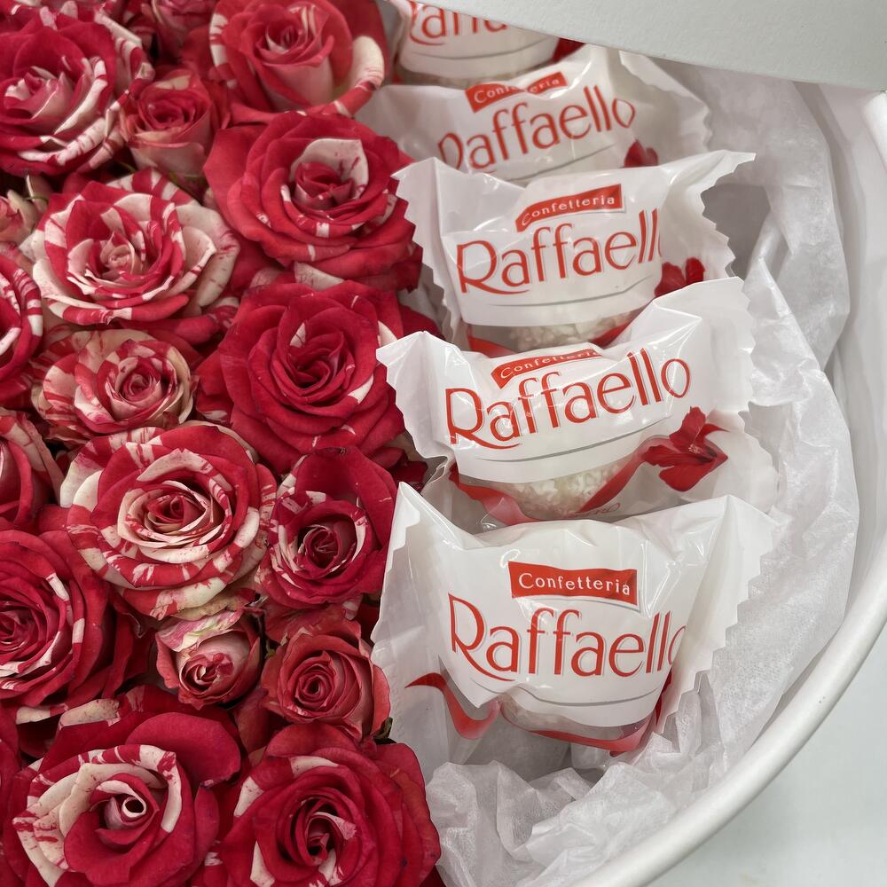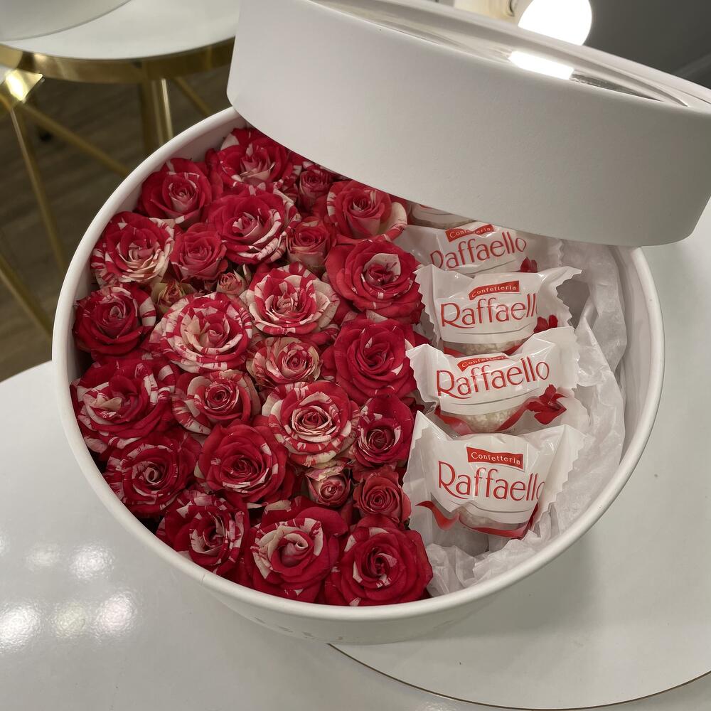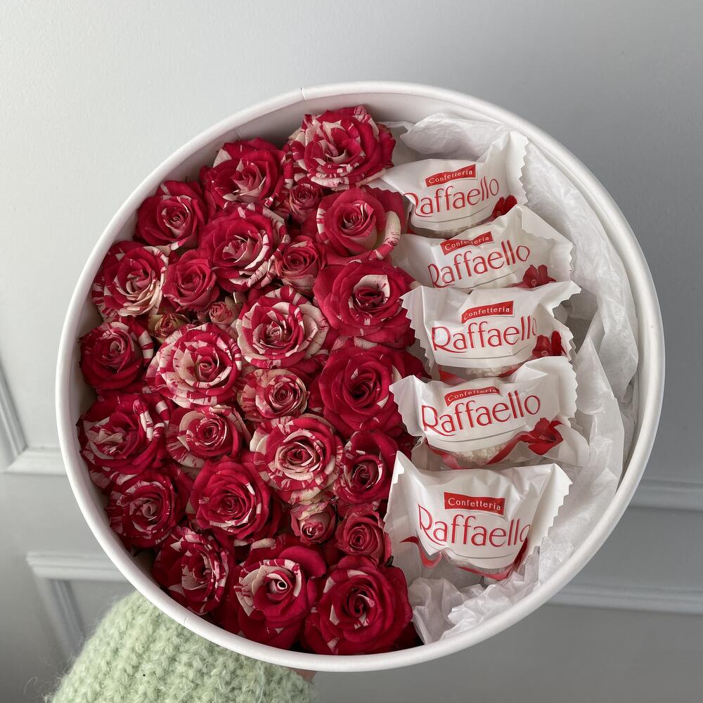 Композиция “Кустовые розы и рафаэлло”