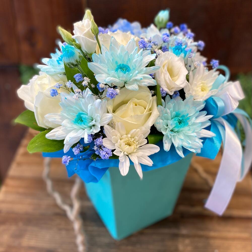 Роза – 3 шт.Хризантема кустовая – 1 шт.Гипсофила – 1 шт.Коробка – 1 шт.Оазис флористический – 1 шт.эустома белая – 1 шт.Рускус – 2 шт.