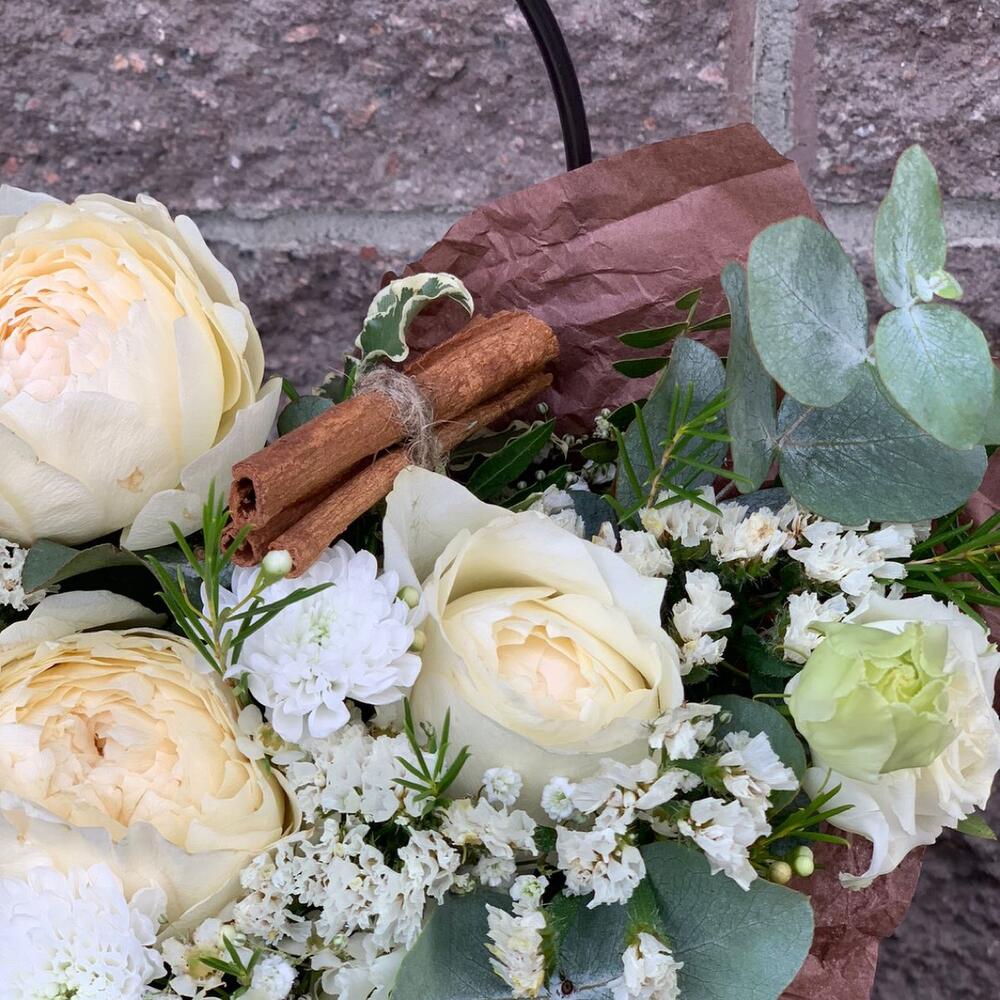 сумочка картонная с оазисом – 1 шт.фисташка зелень – 1 шт.Корейская пленка – 1 шт.тишью коричневый – 1 шт.лизиантус белый махровый – 1 шт.Палочки корицы – 3 шт.Фрезия белая – 1 шт.Ваксфлауэр белый – 1 шт.Эвкалипт Микс – 2 шт.Роза пионовидная – 3 шт.лента декоративная – 1 шт.