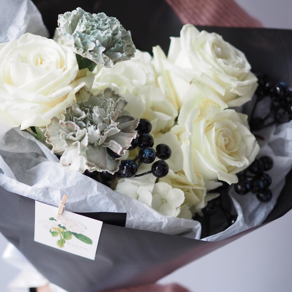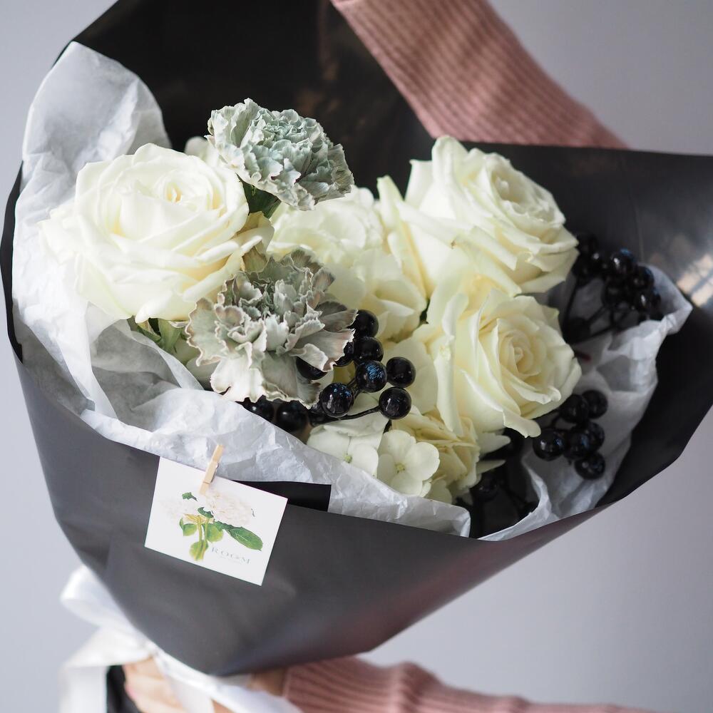 Гортензия – 1 шт.Роза одноголовая – 3 шт.Гвоздика сортовая – 2 шт.Декоративная ягода – 3 шт.Упаковка дизайнерская – 1 шт.