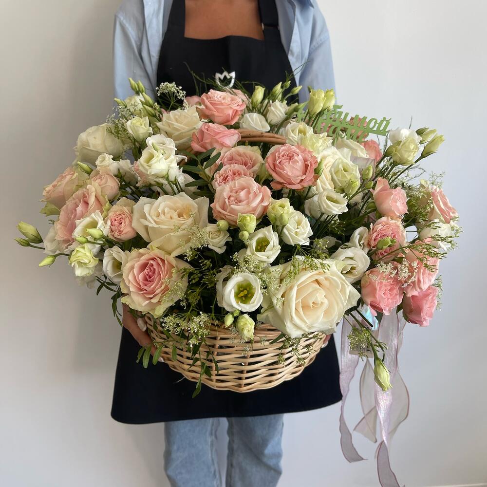 Роза Эквадор – 17 шт.Лента атласная – 2 шт.Фисташка – 7 шт.Корзина плетеная – 1 шт.Оазис флористический – 2 шт.эустома белая – 10 шт.Кустовая роза пионовидная – 10 шт.