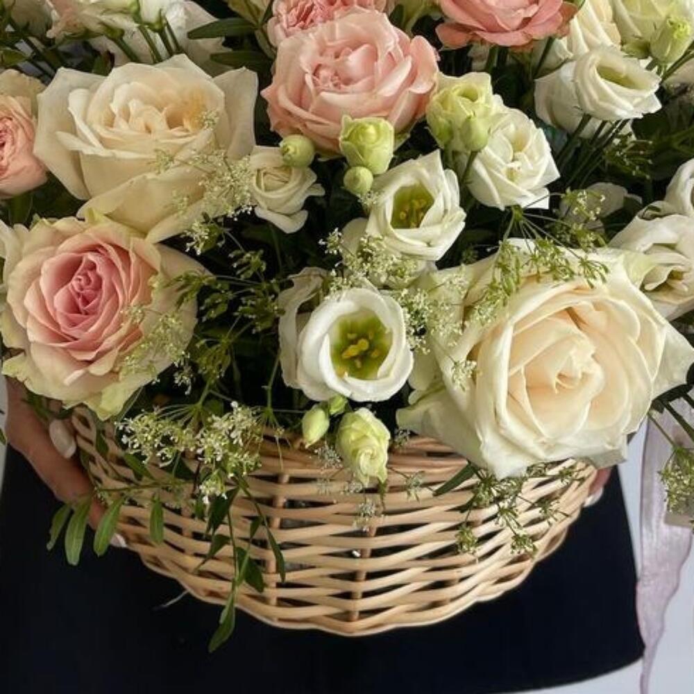 Корзина розами и эустомой
