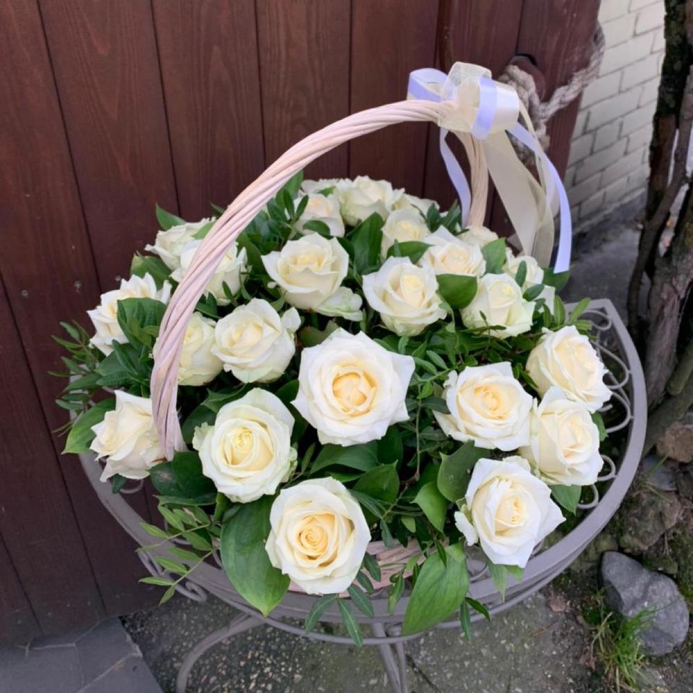 Корзина с белыми розами и зеленью Аваланш