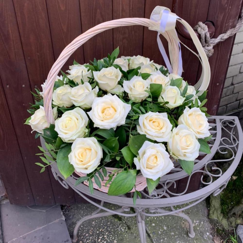 Корзина с белыми розами «Аваланш»