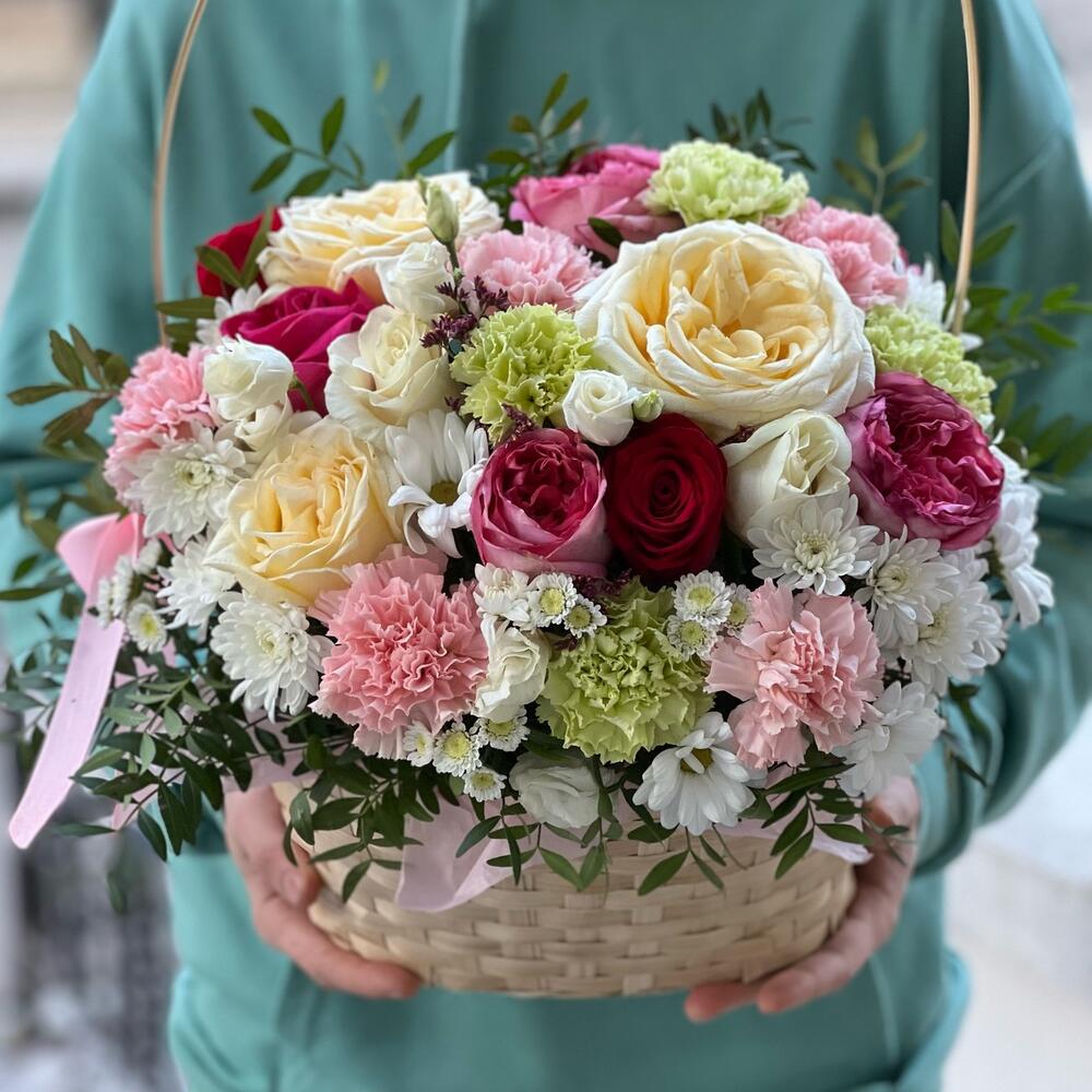 роза пионовидная канделайт – 3 шт.роза пионовидная пинк экспрешн – 4 шт.Роза красная – 2 шт.Роза Pink Floyd – 1 шт.Роза белая мондиаль – 2 шт.лизиантус белый эустома – 2 шт.диантус розовый и зеленый – 9 шт.хризантема кустовая пучок – 3 шт.Фисташка пучок – 5 шт.сталион белый пучок – 3 шт.Оазис флористический – 1 шт.Корзина плетеная – 1 шт.Тишью – 1 шт.