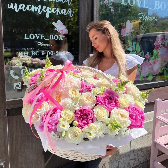 Пион – 10 шт.Лизиантус – 7 шт.Диантус – 8 шт.Роза Эквадор – 15 шт.Роза пионовидная – 6 шт.Корзина плетеная – 1 шт.Оазис флористический – 5 шт.Статица – 5 шт.