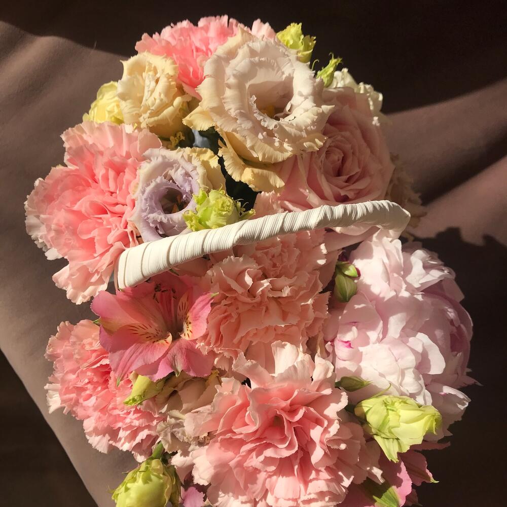 Корзина плетеная – 1 шт.Губка флористическая – 1 шт.Пион Сара Бернар – 1 шт.Роза розовая – 1 шт.Эустома – 2 шт.Гвоздика – 5 шт.