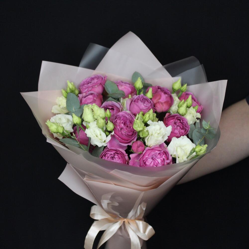 роза кустовая пионовидная misty bubbles – 4 шт.эустома махровая белая – 3 шт.Эвкалипт – 2 шт.Пленка матовая – 5 шт.Лента атласная – 2 шт.