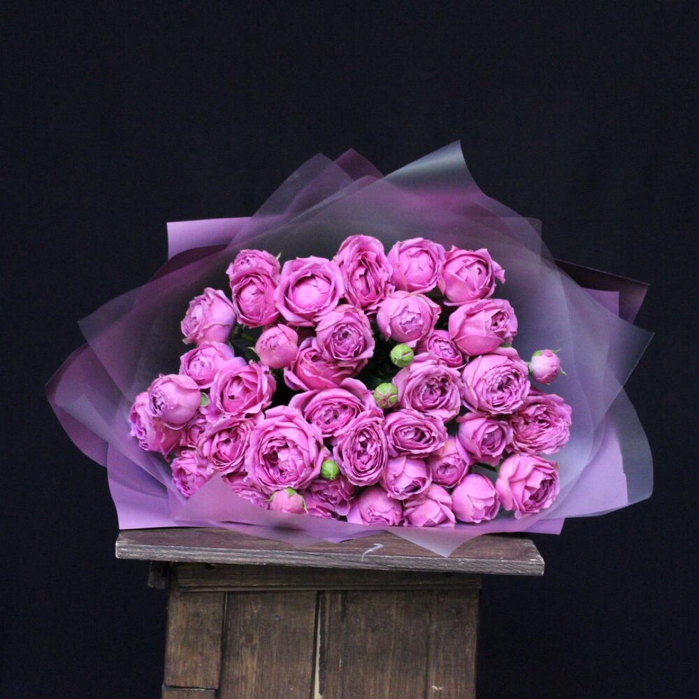 Лента атласная – 1 шт.Пленка дизайнерская – 3 шт.роза кустовая пионовидная misty bubbles – 15 шт.