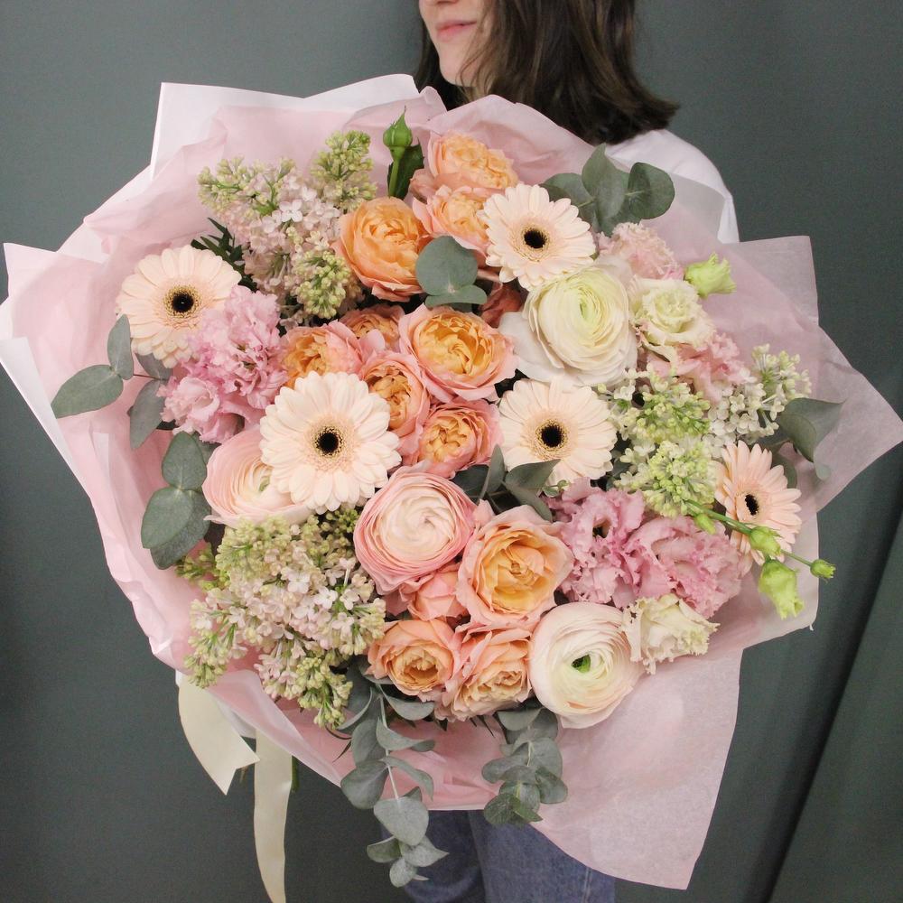 Лизиантус – 3 шт.Гербера – 5 шт.Роза кустовая пионовидная – 4 шт.Эвкалипт – 9 шт.Упаковка дизайнерская – 2 шт.Ранункулюс – 5 шт.Упаковка – 1 шт.