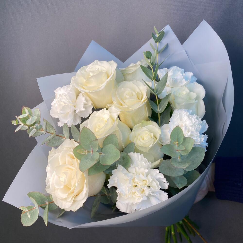 роза мондиаль белая – 7 шт.диантус белый сортовой – 4 шт.эвкалипт ценария большая ветка – 1 шт.Упаковка дизайнерская – 3 шт.