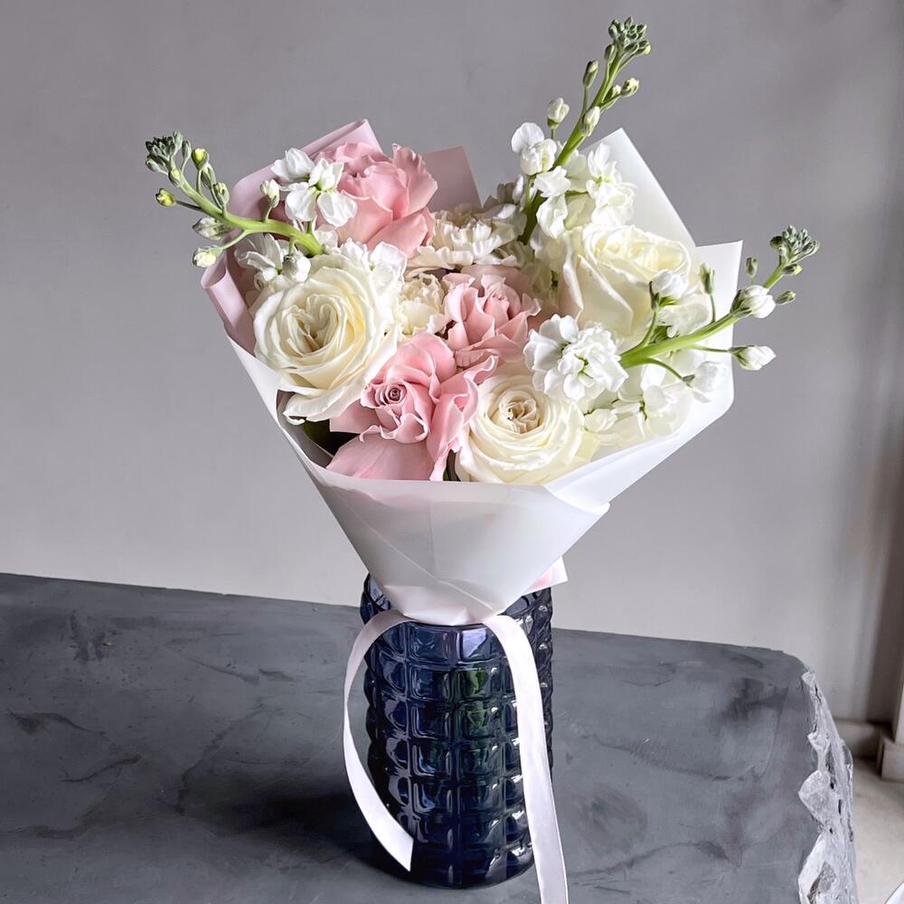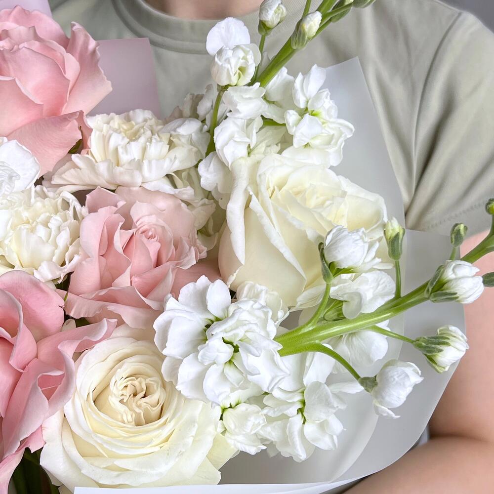 роза faith премиум – 3 шт.роза playa blanca премиум – 3 шт.Маттиола – 3 шт.Гвоздика белая – 2 шт.Дизайнерская упаковка – 1 шт.Лента – 1 шт.