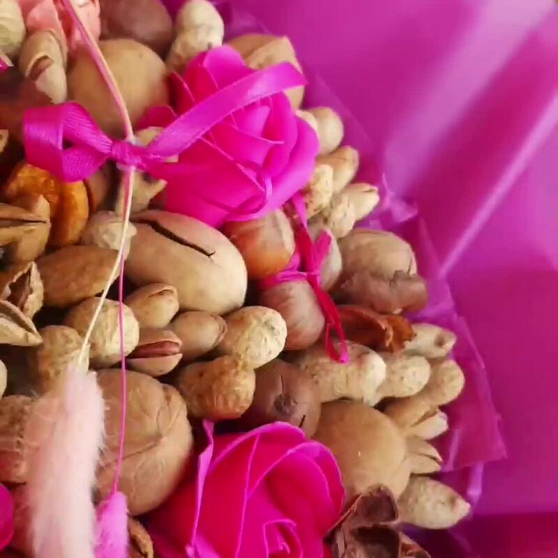 грецкие орехи – 115 гр.Орехи фундук – 25 гр.Фисташки – 18 гр.орехи макадамия – 20 гр.орехи миндаль – 40 гр.Арахис – 50 гр.орехи пекан – 16 гр.конфета роше – 1 шт.розы из мыльной пенки – 3 шт.коробка транспортировочная – 1 шт.