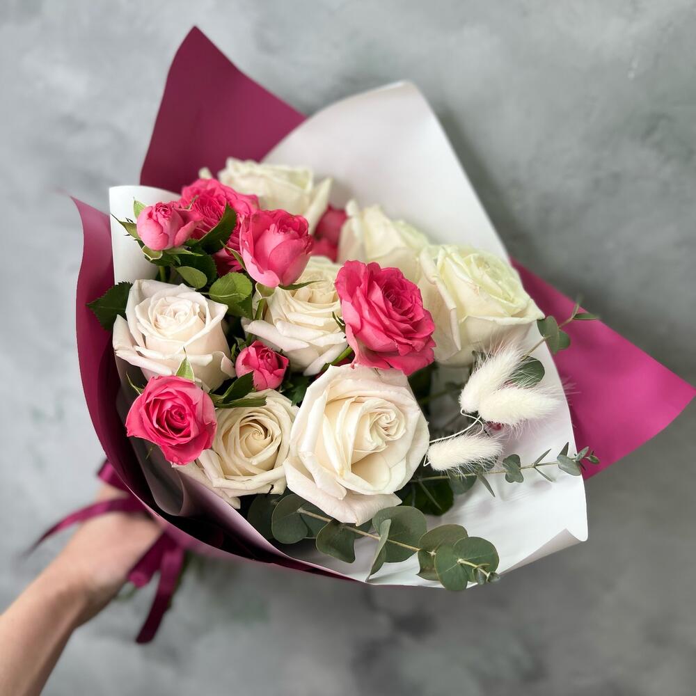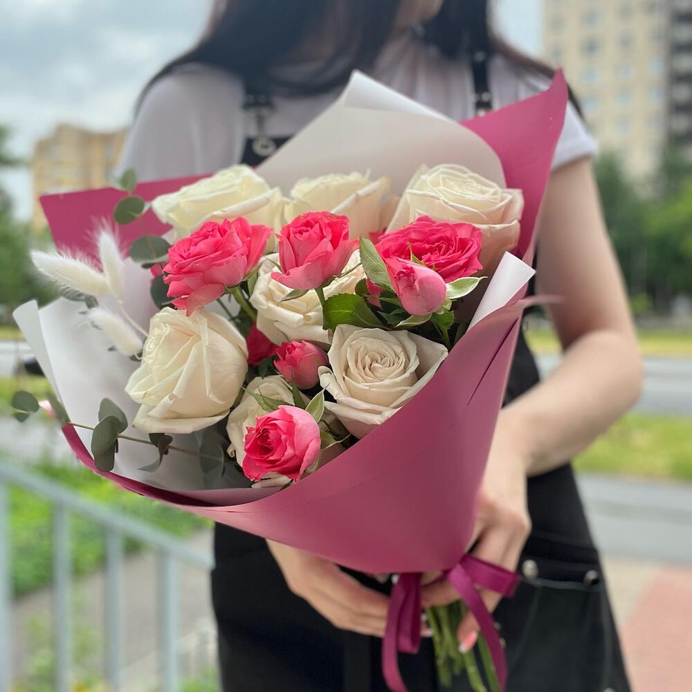 Гвоздики, Кустовые розы, Лизиантусы, Пионовидные розы, Розы