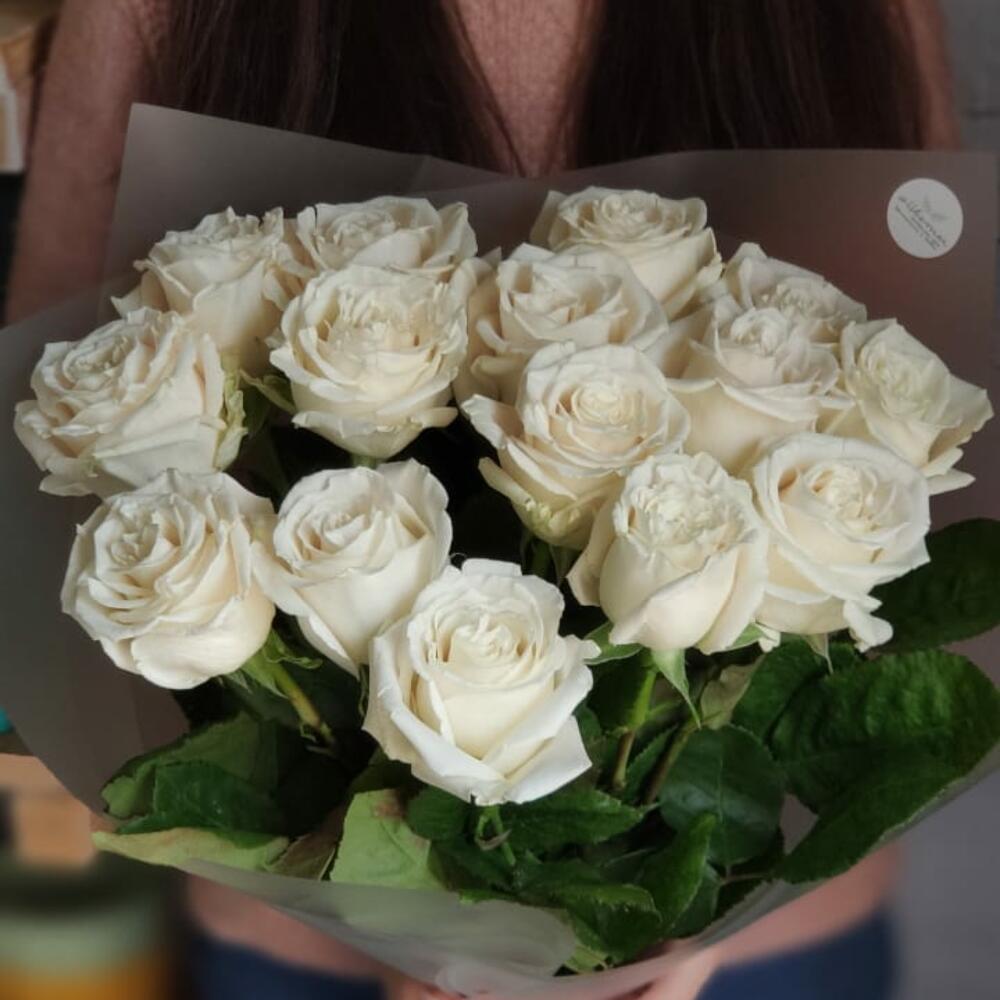15 белоснежных роз сорта Playa Blanca (Плая Бланка) в моно-букетеКлассическое раскрытие бутона, хорошая стойкостьБукет оформлен упаковкой и атласными лентами