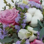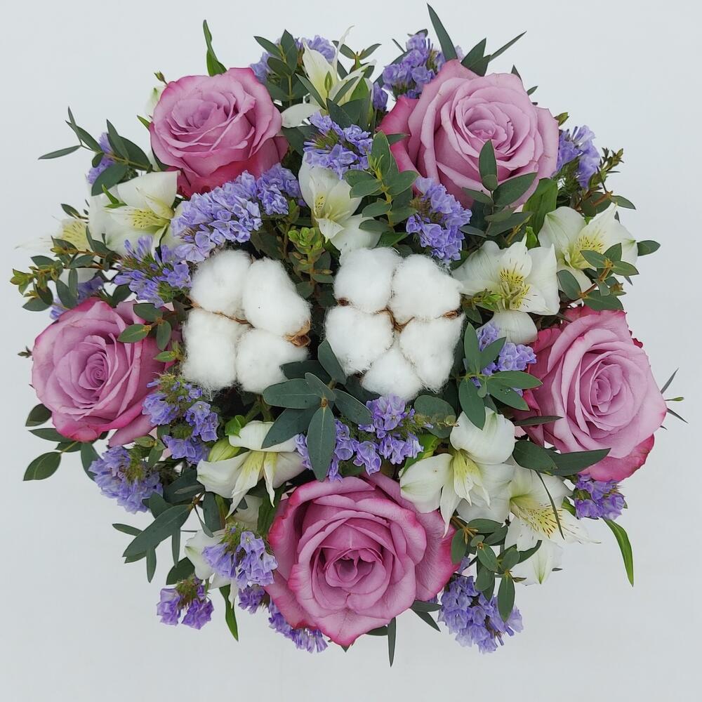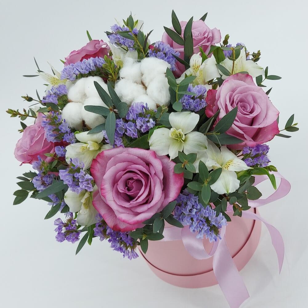 Розы, альстромерия и хлопок в коробке “Сиреневые облака”