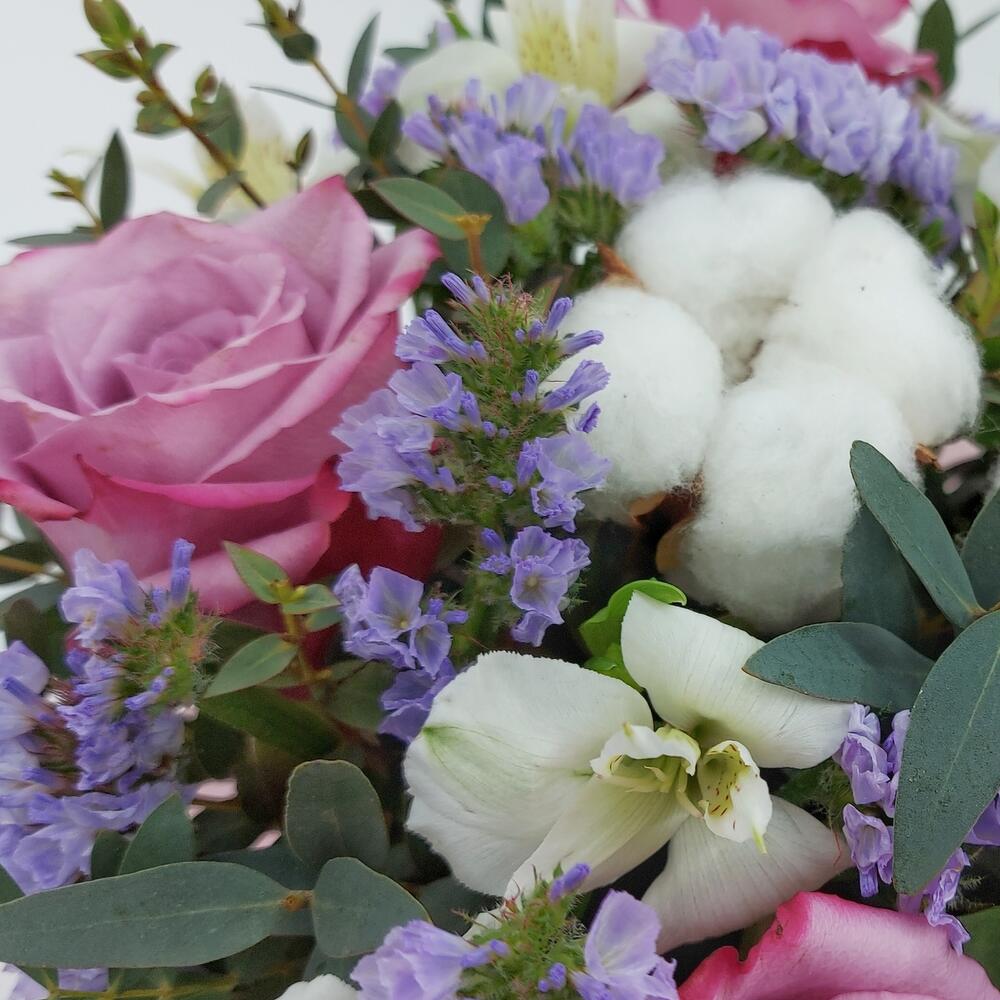 Розы, альстромерия и хлопок в коробке "Сиреневые облака"
