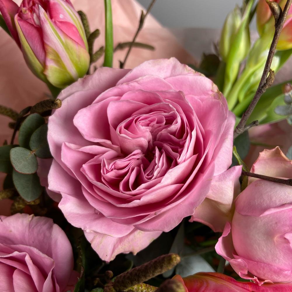 Букет Лилас из кустовых пионовидных роз и диантуса