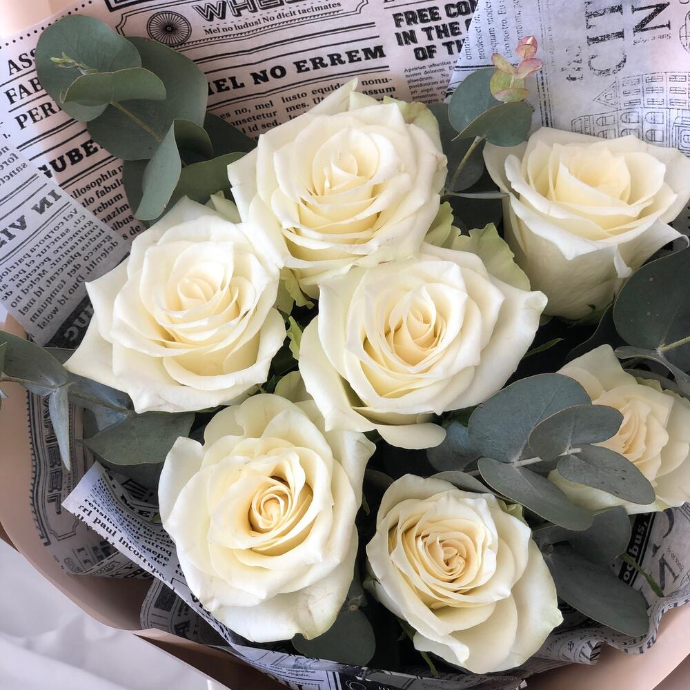 Белые кенийские розы с веточками эвкалипта в стильном оформлении.