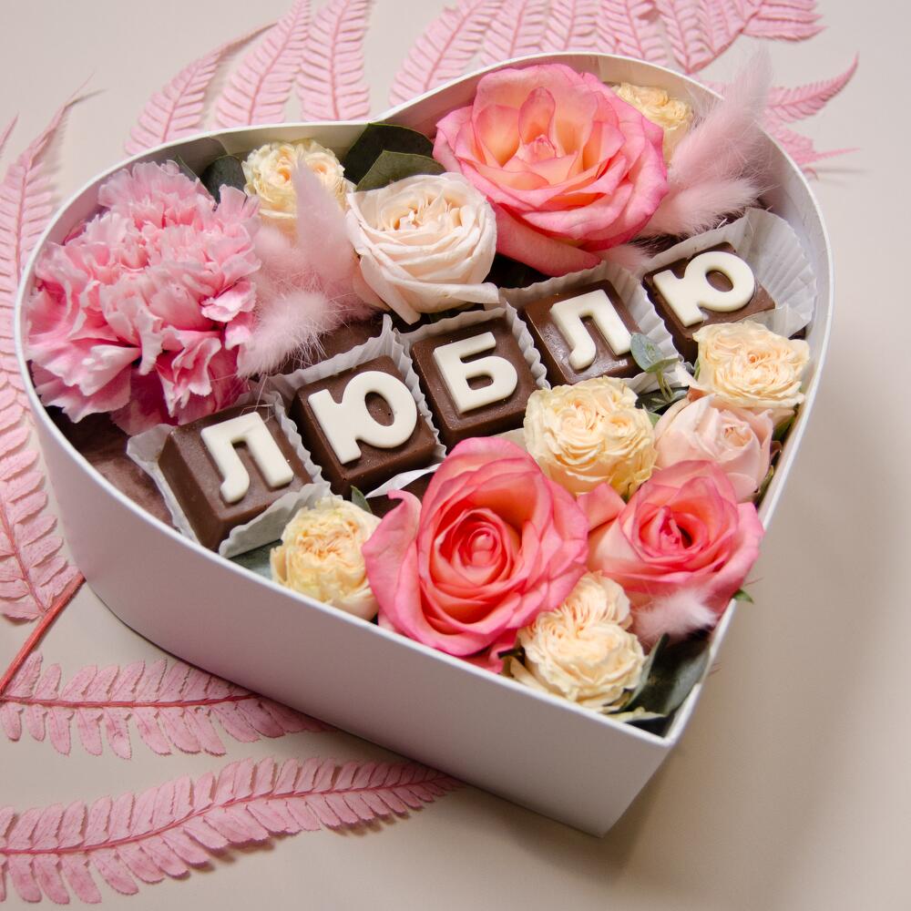 Шоколадные буквы – 5 шт. Коробка – 1 шт. Гвоздика – 1 шт. Роза кустовая – 3 шт. Роза сортовая – 3 шт.