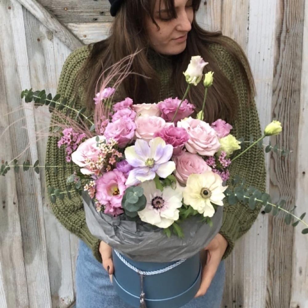 Маттиола – 3 шт.Роза – 7 шт.Лизиантус – 3 шт.Ваксфлауэр – 3 шт.Эвкалипт – 5 шт.Ковыль – 2 шт.Шляпная коробка – 1 шт.Тишью – 2 шт.Оазис – 1 шт.Анемон – 3 шт.