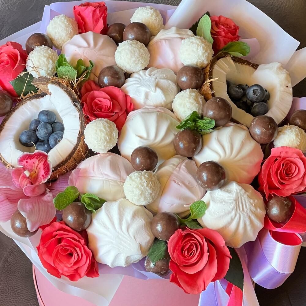 Зефир ванильный – 12 шт.рафаело – 15 шт.конфеты в глазури – 25 шт.Роза – 9 шт.Кокос – 1 шт.Голубика – 100 гр.Коробка шляпная – 1 шт.Оазис флористический – 1 шт.Лента атласная – 1 шт.Упаковка дизайнерская – 1 шт.Мята – 15 шт.работа флориста – 1 шт.