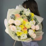 Ароматный, весенний букет с солнечным настроением.Букет приедет в подарочной коробке, с рекомендациями по уходу за цветами.При необходимости, если букет с нежными цветами или ему предстоит весомое время в дороге – то цветы мы отравляем на воде, останется лишь аккуратно снять кулёчек с водой и поставить букет в подходящую вазу.К каждому букету мы подписываем открытку с вашим посланием – эта услуга, так же в подарок.