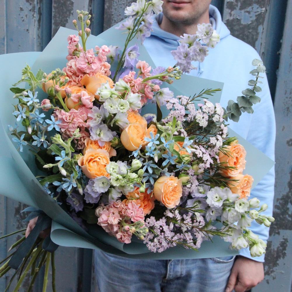 Роза пионовидная кустовая – 3 шт.Твидия – 4 шт.Ваксфлауэр – 3 шт.Маттиола – 4 шт.Эвкалипт – 5 шт.Упаковка дизайнерская – 2 шт.Лента атласная – 2 шт.Астранция – 2 шт.Дельфиниум – 3 шт.