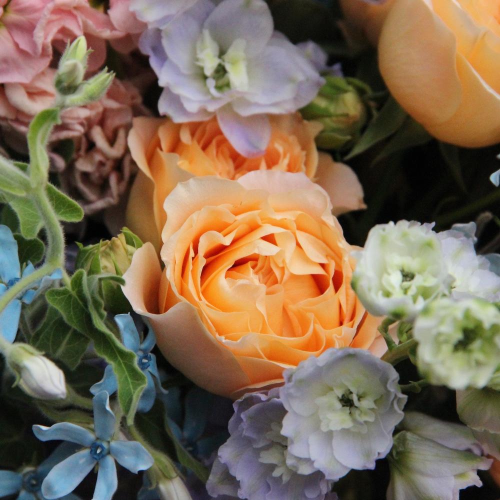 Авторский букет с пионовидными розами, маттиолой, ваксфлауэром и твидией.
