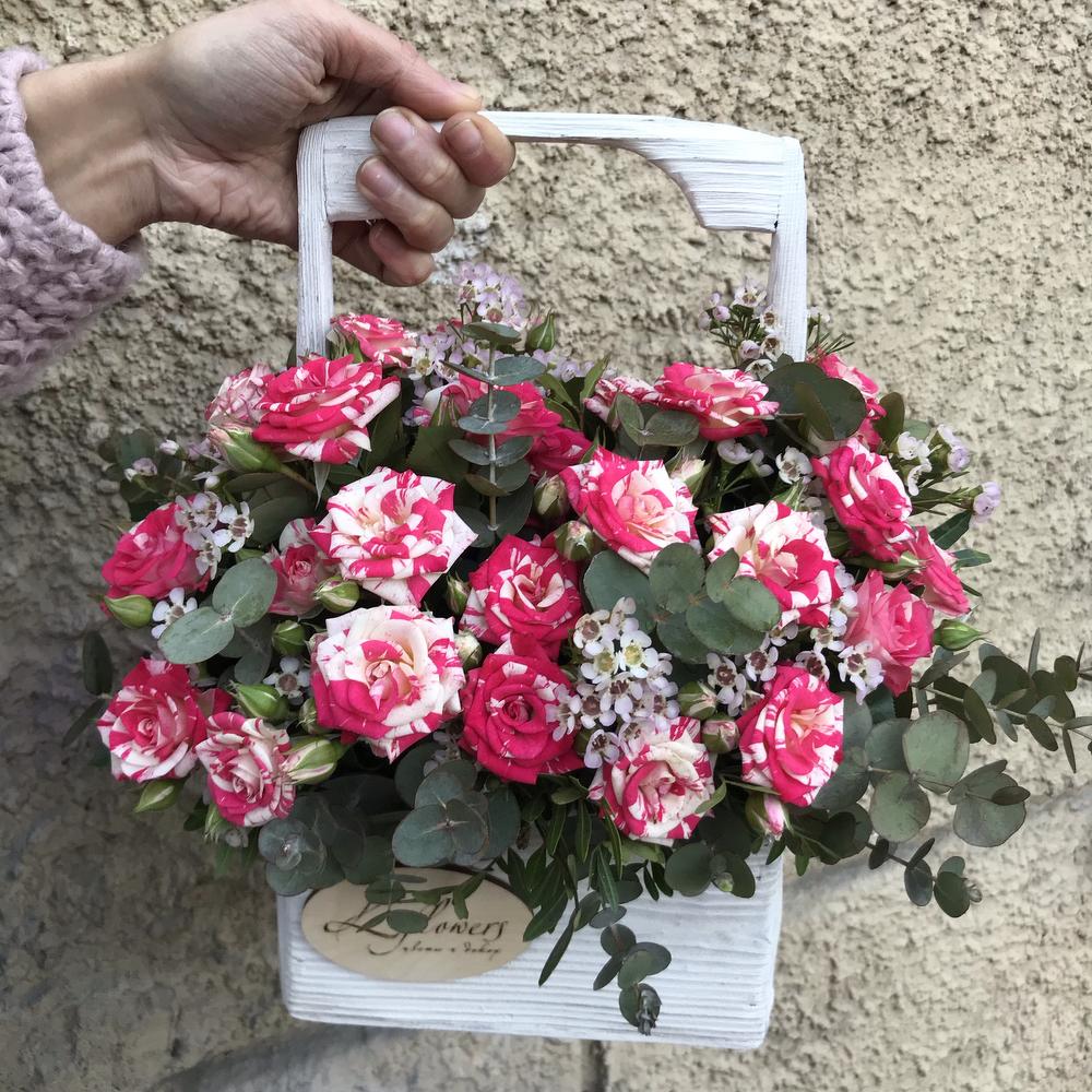 роза кустовая мраморная – 7 шт.Ваксфлауэр – 4 шт.Эвкалипт – 4 шт.Ящик деревянный – 1 шт.
