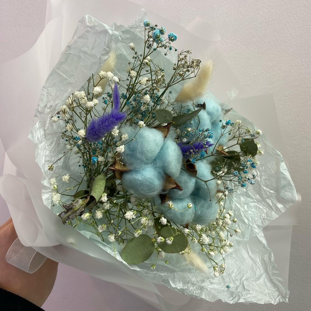Хлопок – 3 шт.Лагурус – 3 шт.Эвкалипт – 1 шт.Гипсофила – 2 шт.Авторская упаковка – 1 шт.Открыточка с вашими пожеланиями – 1 шт.