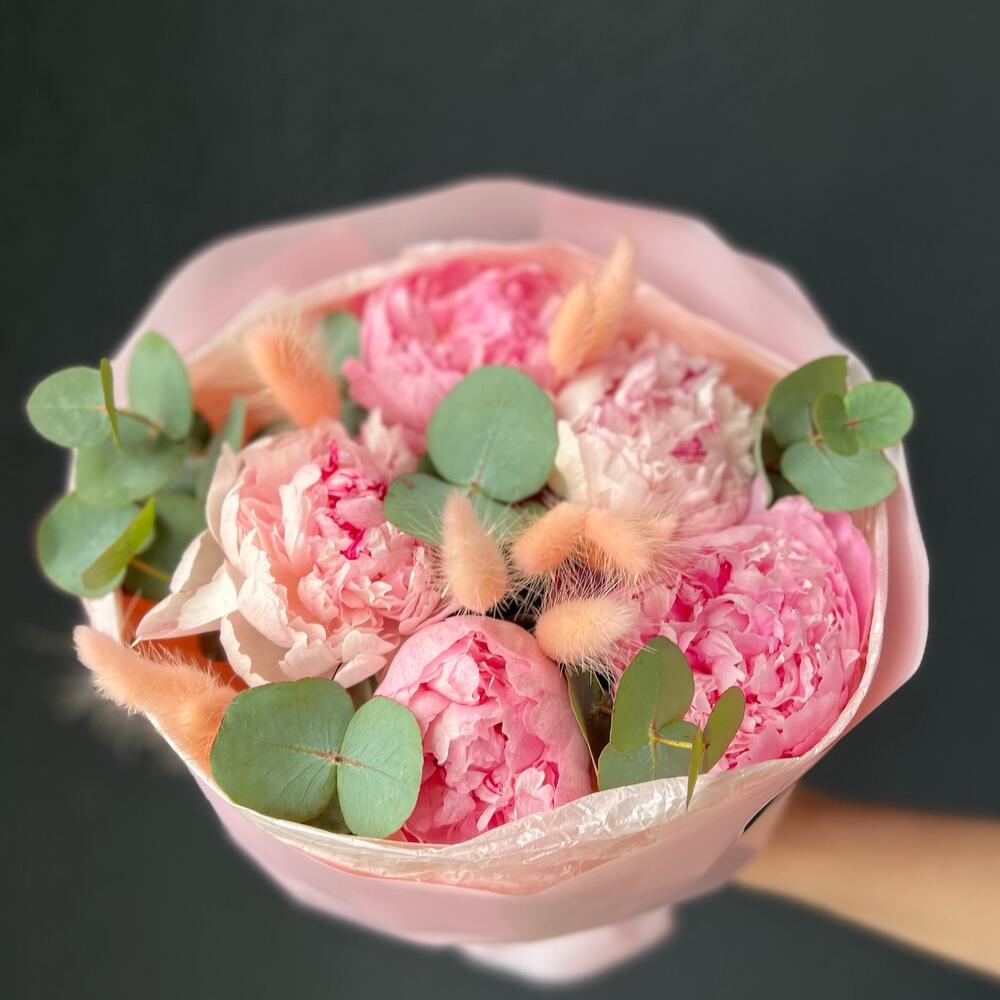 Пион – 5 шт.Лагурус – 10 шт.Эвкалипт – 3 шт.декоративная упаковка – 1 шт.Атласная лента – 1 шт.