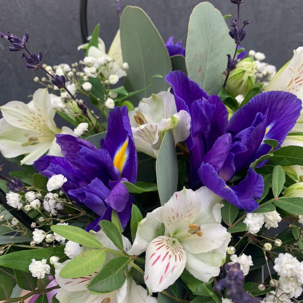 Ирисы с альстромериями, гипсофилой и лавандой с зеленью в сумочке