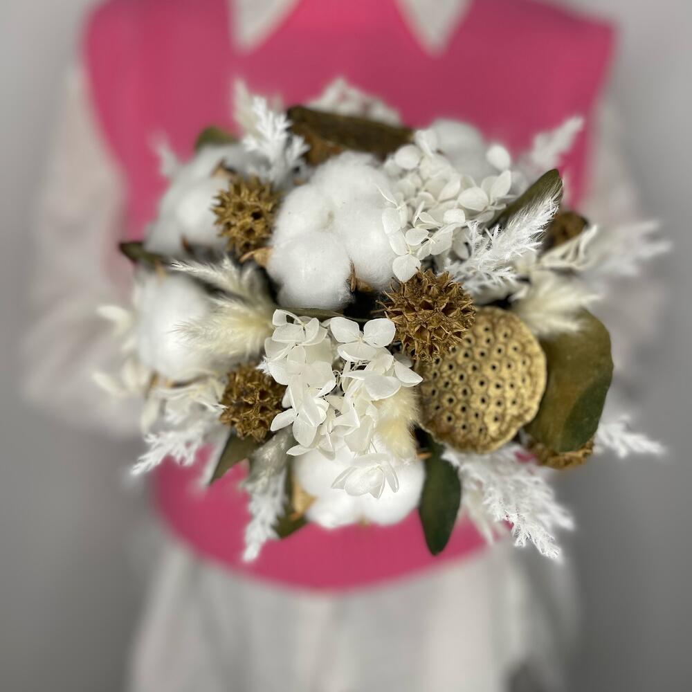 Хлопок – 11 шт.Кашпо керамическое – 1 шт.Оазис для сухоцветов – 1 шт.Эвкалипт сухоцвет – 2 шт.гортензия сухоцвет – 1 шт.рускус сухоцвет – 1 шт.лотос сухоцвет – 3 шт.камыш сухоцвет – 2 шт.