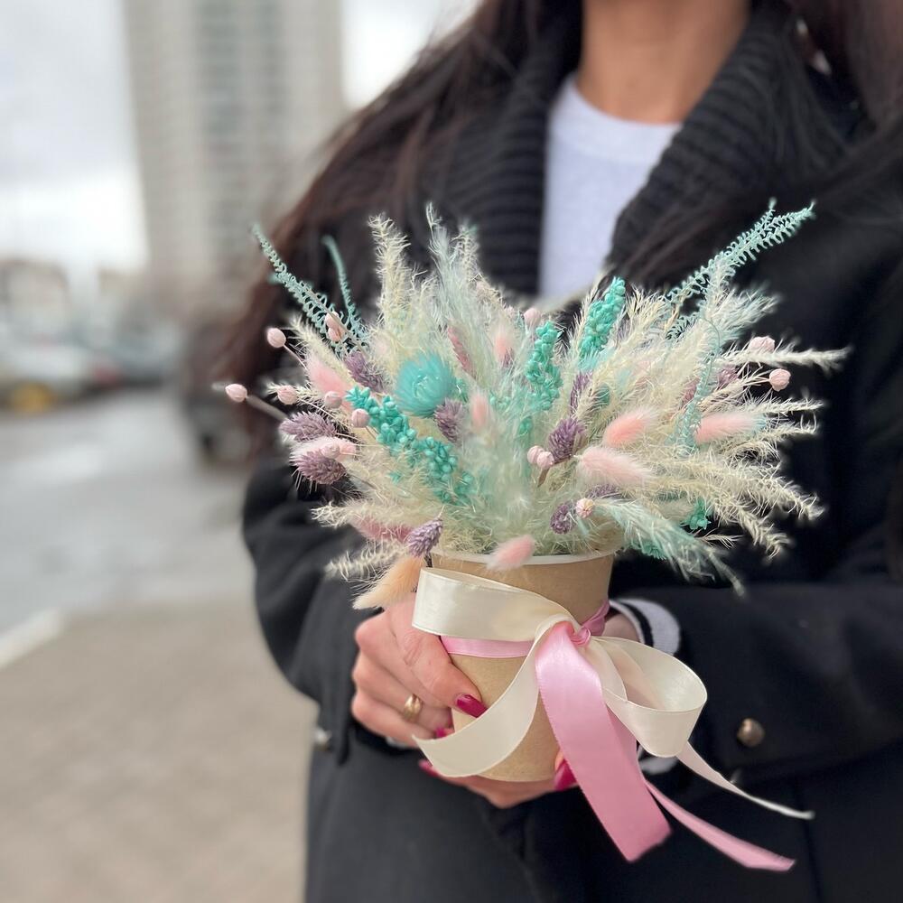 Стакан крафт дизайнерский – 1 шт.Лента атласная – 2 шт.Оазис флористический – 1 шт.кортадерия ( бежевая ) – 5 шт.Лагурус – 19 шт.фаларис сухоцвет – 20 шт.