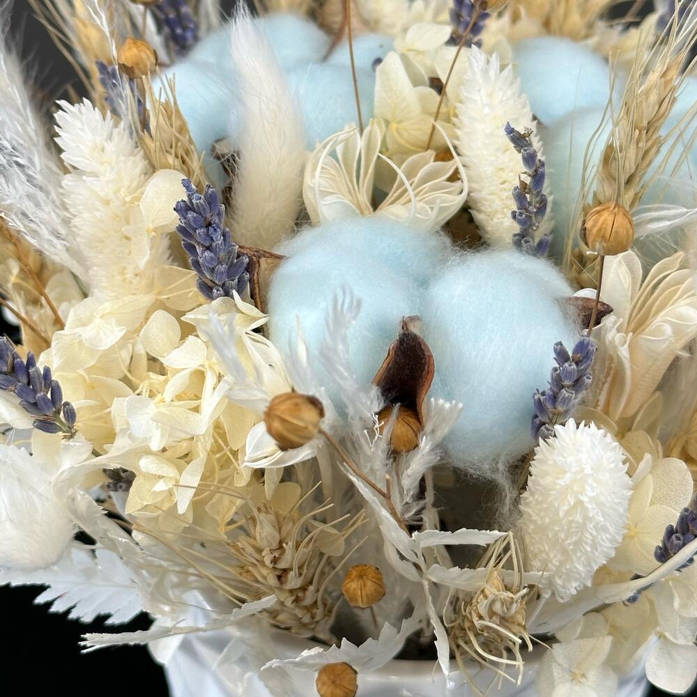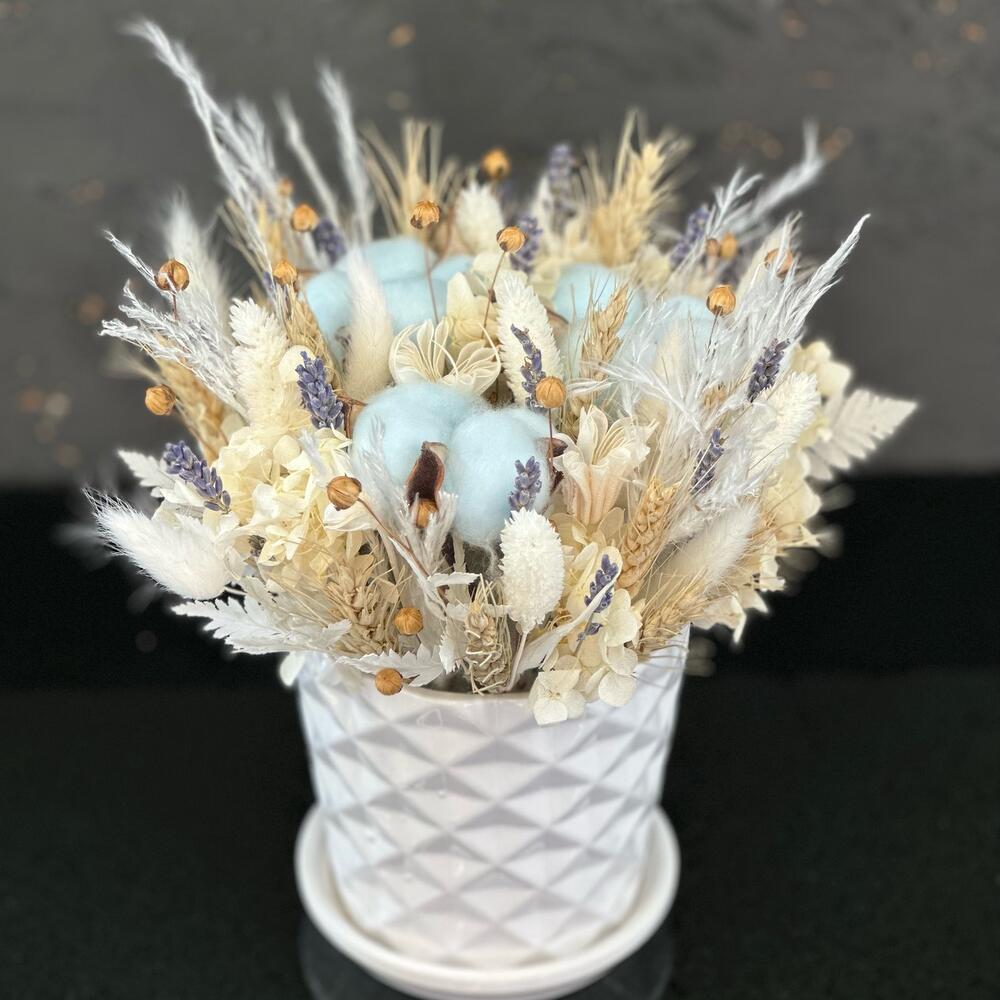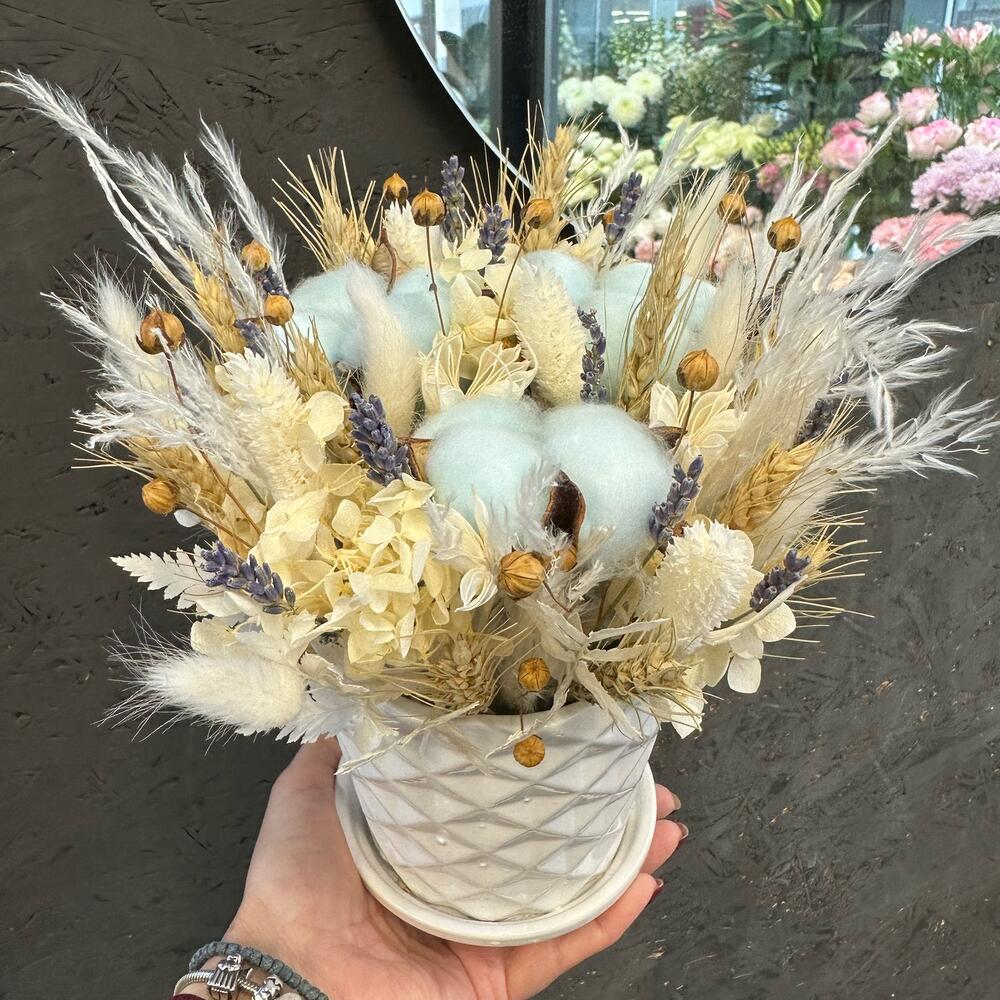 Кашпо керамическое – 1 шт.Оазис – 1 шт.Хлопок – 3 шт.Гортензия – 1 шт.Лаванда (сухоцвет) – 10 шт.Сухоцветы – 20 шт.