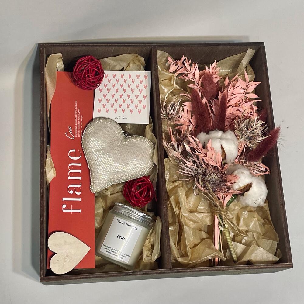 В набор входит:- аромасвеча Cora (грейпфрут, розовый перец, ревень, лаванда, ваниль)- благовония Cora- букет из сухоцветов- шар ротанговый 2шт- сердце деревянное 2шт- сердце мягкое с бисером- открыточка (текст можете написать в комментариях)- деревянный ящик