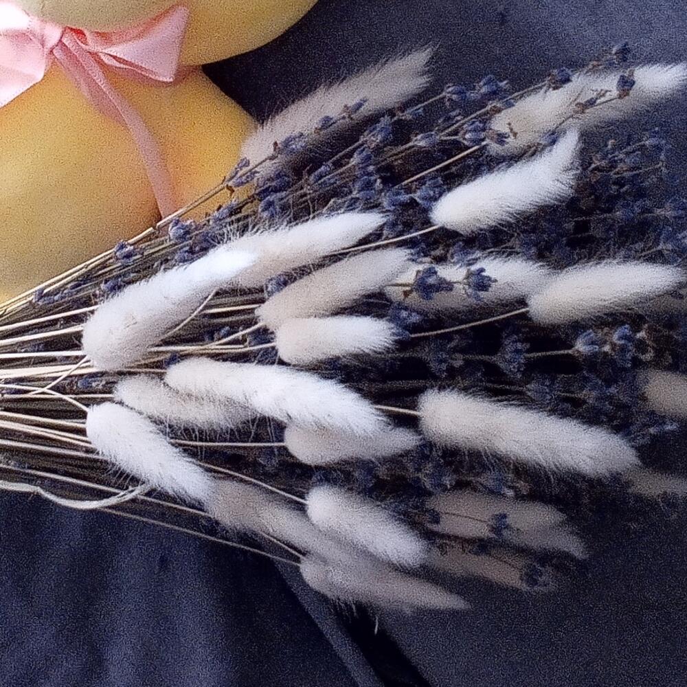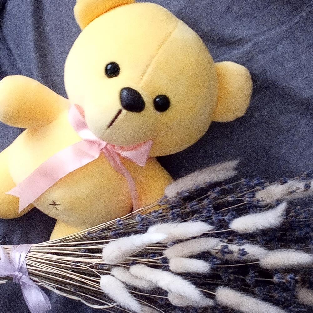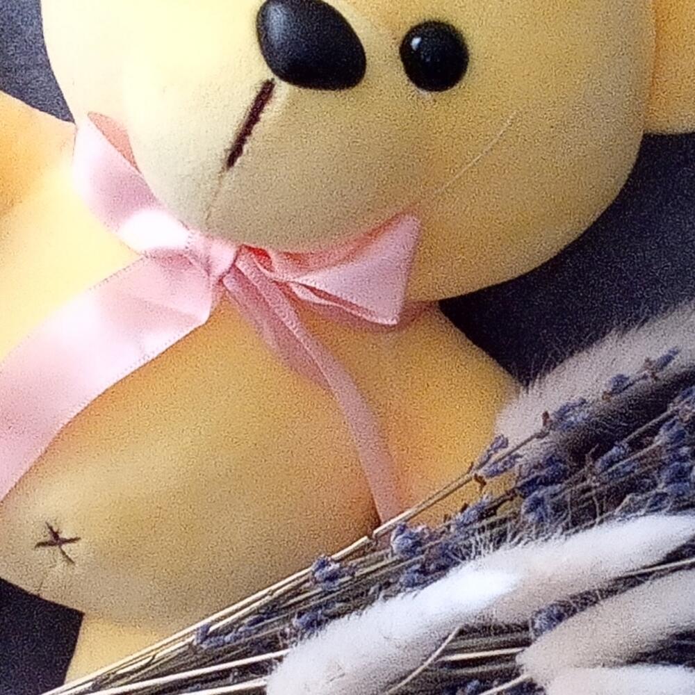 мишка плюшевый 23 см – 1 шт.Лаванда (сухоцвет) – 85 шт.Лагурус (сухоцвет) – 11 шт.Лента атласная – 1 шт.