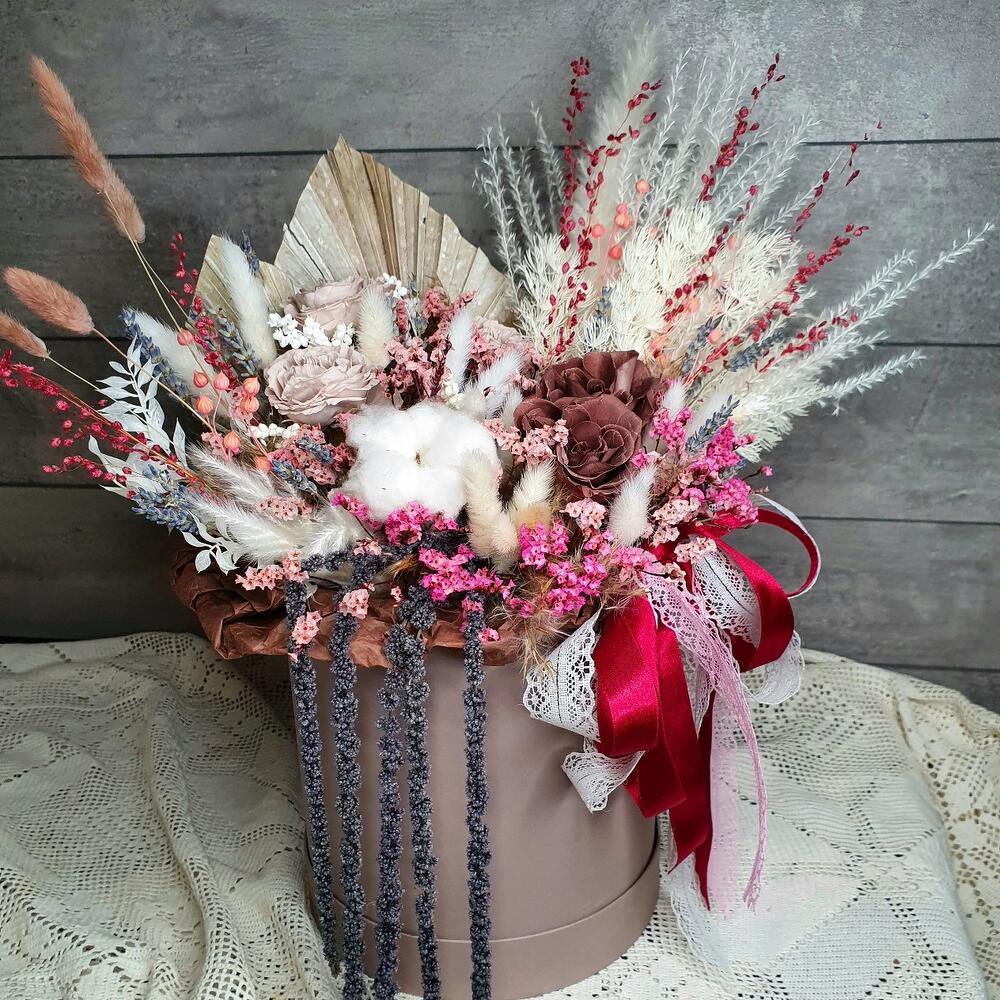 стабилизированные розы – 5 шт.аурея белая – 2 шт.Хлопок натуральный – 1 шт.Лагурус – 16 шт.лен сухоцвет – 3 шт.бриза пучок – 2 шт.копье пальмы – 1 шт.амарант стабилизированный – 5 шт.статица стабилизированная – 9 шт.рускус стабилизированный выбеленный – 1 шт.сорго – 3 шт.лавандин пучок – 1 шт.аспарагус стабилизированный выбеленный – 1 шт.Шляпная коробка – 1 шт.Лента – 2 шт.Тишью – 1 шт.