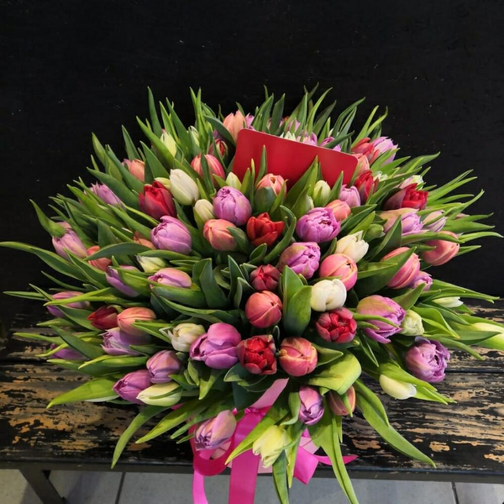 Коробка шляпная – 1 шт.Тюльпан – 101 шт.бант атласный – 1 шт.