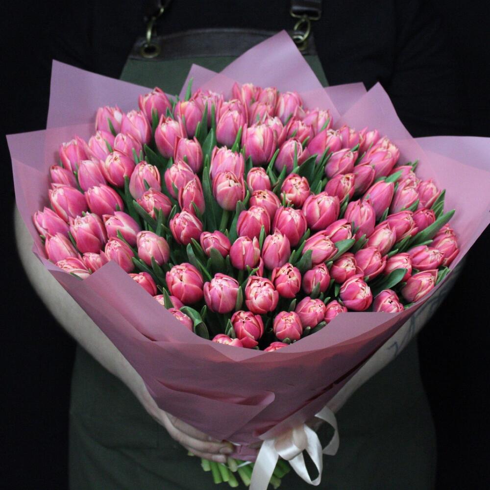 тюльпан пионовидный коламбус – 101 шт.Пленка матовая – 5 шт.Лента атласная – 1 шт.