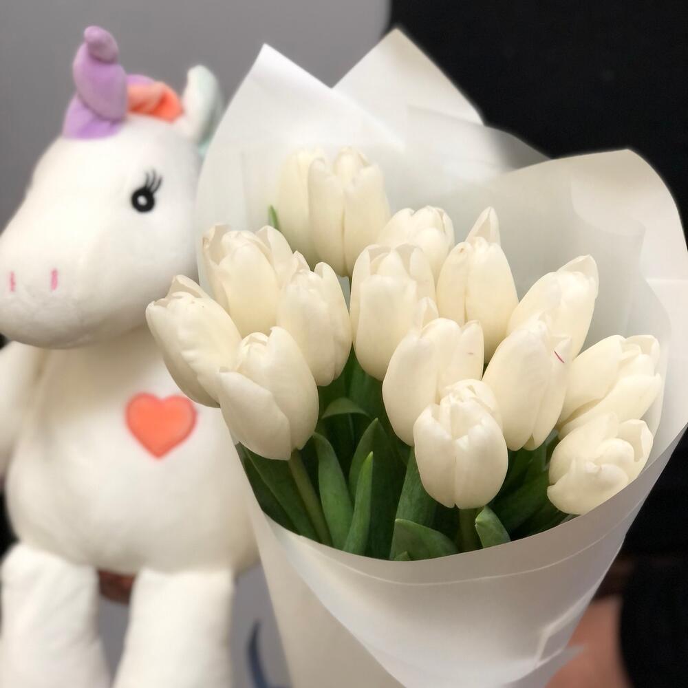 Лента атласная – 1 шт.Упаковка дизайнерская – 1 шт.Тюльпан белый – 15 шт.мягкая игрушка единорог – 1 шт.