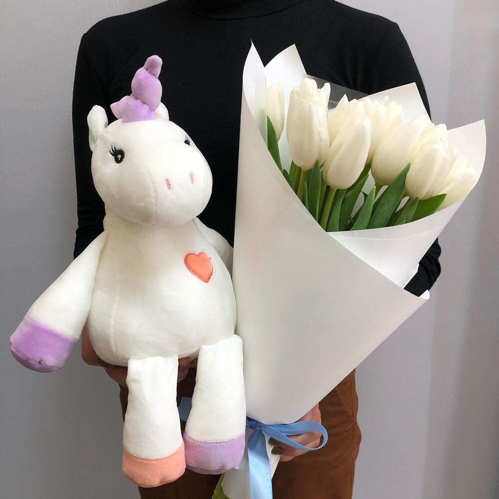 Набор: букет тюльпанов и мягкая игрушка «Единорог»
