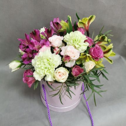Ароматная большая шляпная коробка с кустовыми розами микс, хамелациумом и эвкалиптом