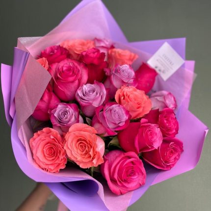 Пышный нежный и ароматный букет “Рассвет в любви” с розами, эвкалиптом, лизиантусом и генистой